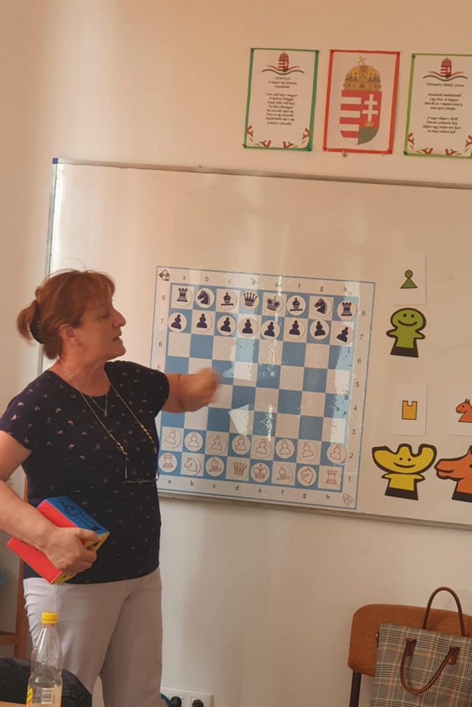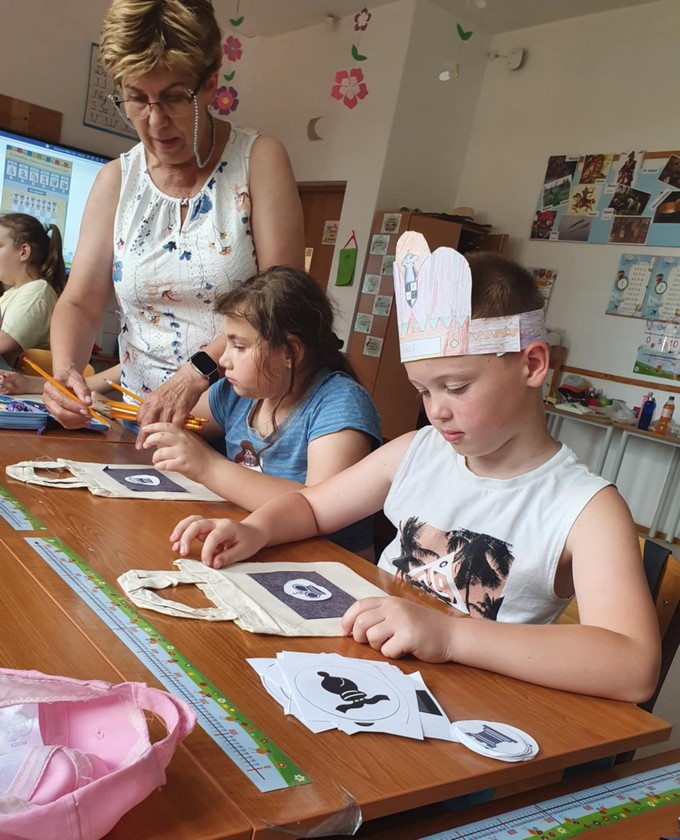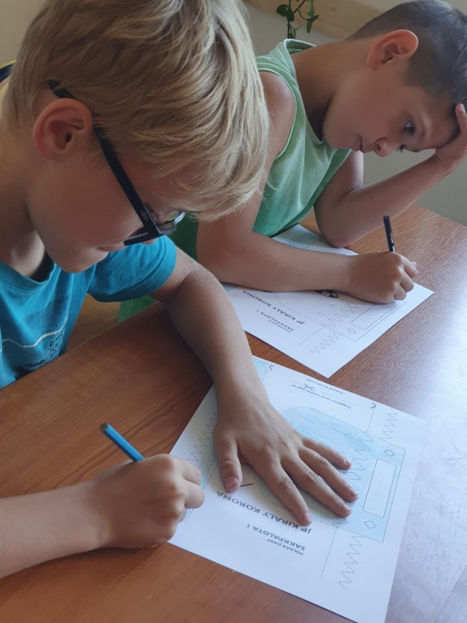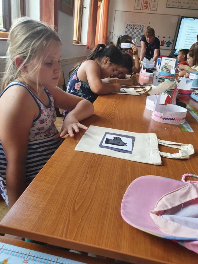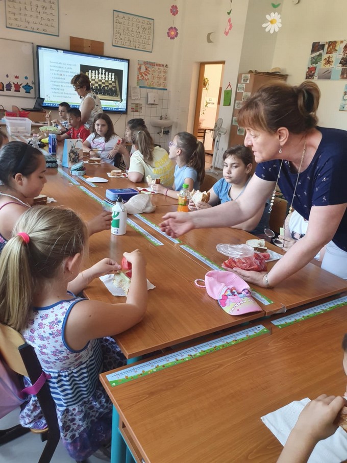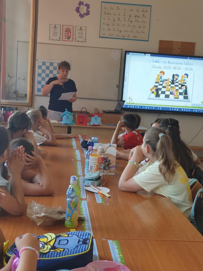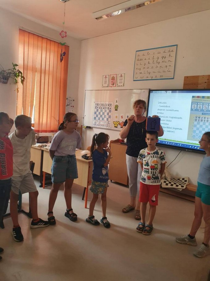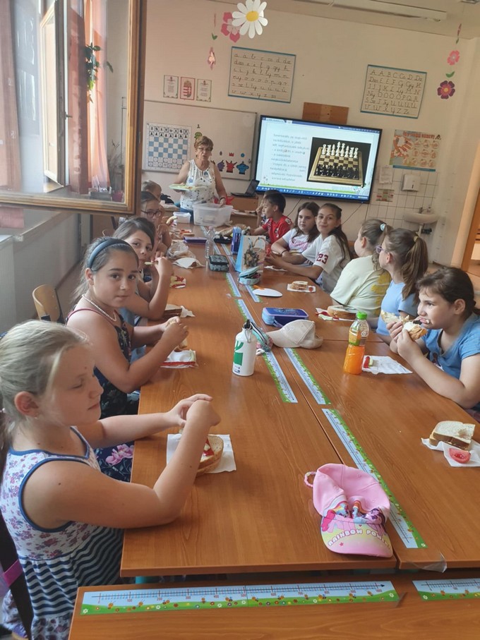 2025. június 30-án második alkalommal jelentkezhettek a Szabó Pál Ált. Isk. tanulói a Huszárné Müller Zita által vezetett sakktáborba. Az előző évihez hasonlóan nagyon sok játékos program ismerteti meg a gyerekekkel lépésről, lépésre ezt a stratégiai játékot, ami egyszerű és nagyszerű is egyben, figyelembe véve annak rengeteg fejlesztő hatását. A napunkat egy kis lelkesítő tornával indítottuk. A kézműves foglalkozásokon éppúgy, mint a nap során bármikor, a sakk kapta a főszerepet. A kreatív mintázatú koronákon, fejdíszeken a király és a vezér alakját színezték a résztvevők. A nagy meleg sem tartotta vissza a leendő sakkmestereket egy kis mozgásos játéktól. Remek hangulatban zajlott az Adj király katonát! A nap során a Monostor étteremben fogyasztottuk el az ebédünket udvarias és figyelmes kiszolgálás mellett. Az iskolában finom barack várta a sakkozókat. A délutánra tervezett tudás megszerzése után ismét kézműveskedés következett. Nagyon lelkesen vászontáskákat díszítettek a gyerekek, sakkfigurás nyomdákkal, textilfilcekkel. Alkotásaik olyan mutatósra sikerültek, hogy még szépségversenyre is ajánlották őket készítőik. Közeledve a foglalkozás vége felé, mindenki jóízűen fogyasztotta el egyik kedvenc gyümölcsét, a görögdinnyét.