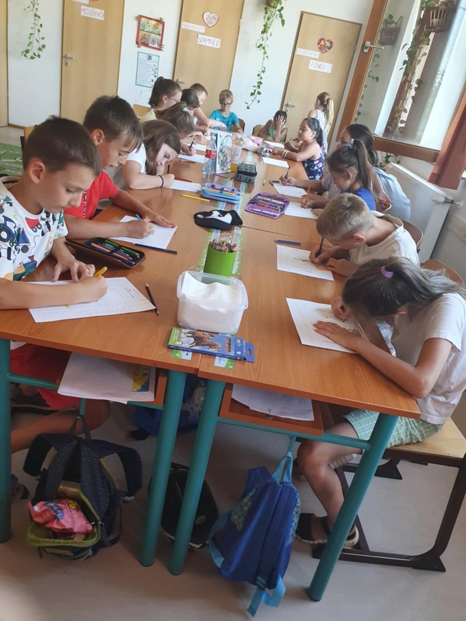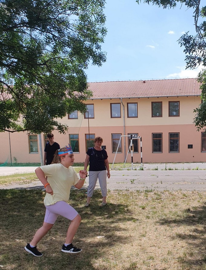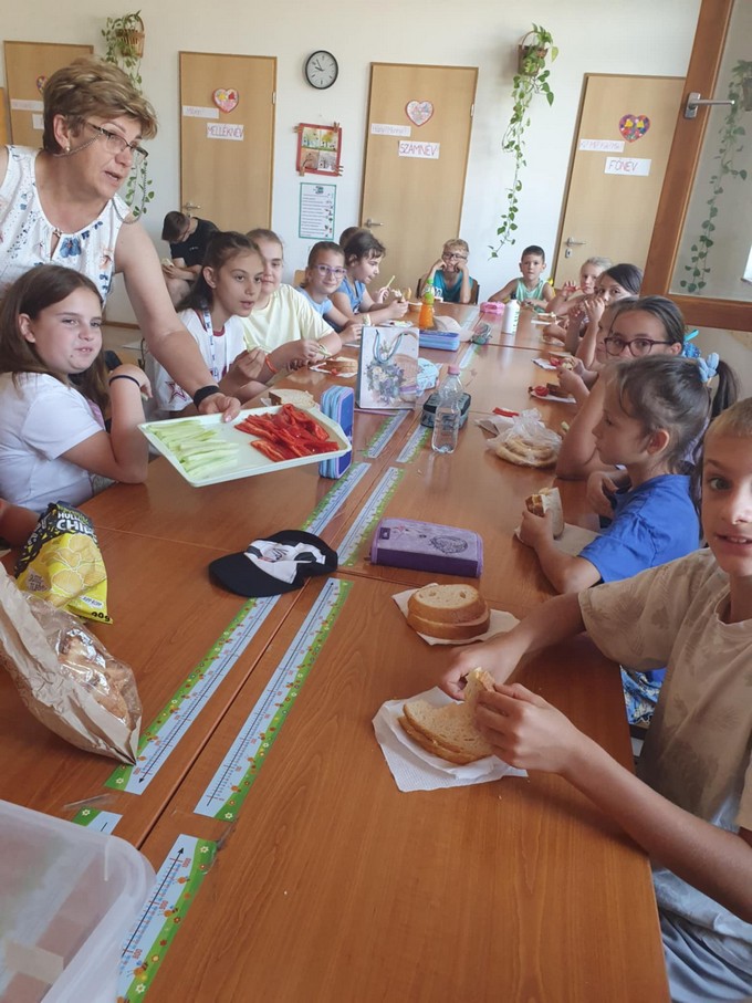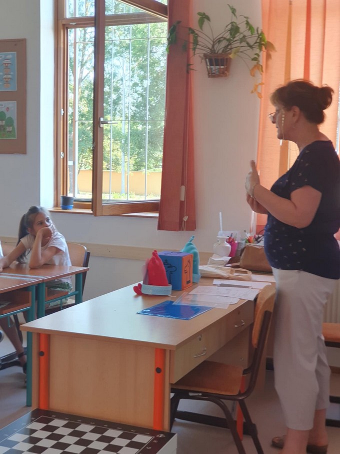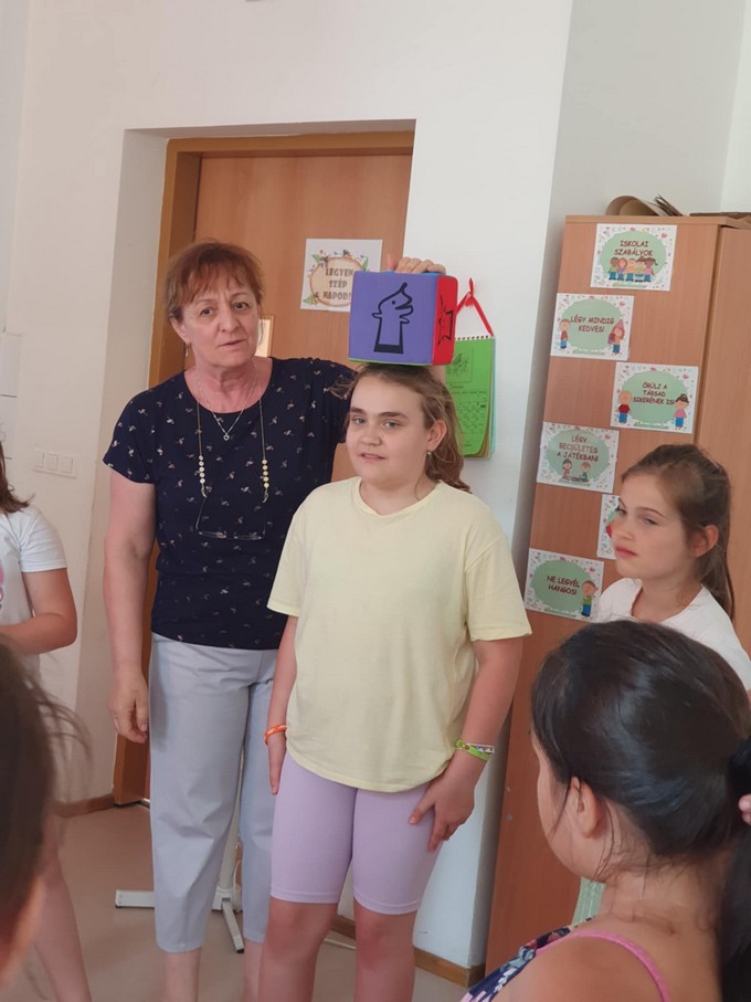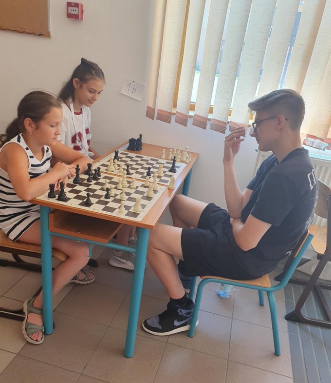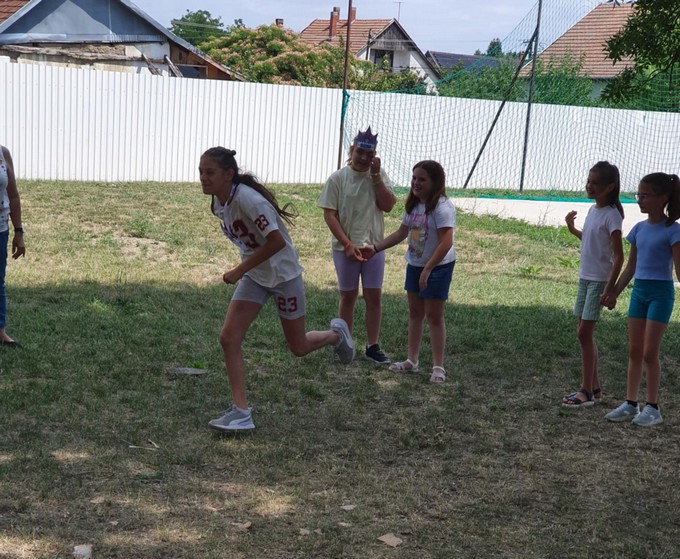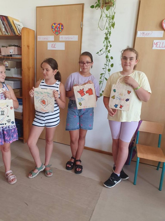 2025. június 30-án második alkalommal jelentkezhettek a Szabó Pál Ált. Isk. tanulói a Huszárné Müller Zita által vezetett sakktáborba. Az előző évihez hasonlóan nagyon sok játékos program ismerteti meg a gyerekekkel lépésről, lépésre ezt a stratégiai játékot, ami egyszerű és nagyszerű is egyben, figyelembe véve annak rengeteg fejlesztő hatását. A napunkat egy kis lelkesítő tornával indítottuk. A kézműves foglalkozásokon éppúgy, mint a nap során bármikor, a sakk kapta a főszerepet. A kreatív mintázatú koronákon, fejdíszeken a király és a vezér alakját színezték a résztvevők. A nagy meleg sem tartotta vissza a leendő sakkmestereket egy kis mozgásos játéktól. Remek hangulatban zajlott az Adj király katonát! A nap során a Monostor étteremben fogyasztottuk el az ebédünket udvarias és figyelmes kiszolgálás mellett. Az iskolában finom barack várta a sakkozókat. A délutánra tervezett tudás megszerzése után ismét kézműveskedés következett. Nagyon lelkesen vászontáskákat díszítettek a gyerekek, sakkfigurás nyomdákkal, textilfilcekkel. Alkotásaik olyan mutatósra sikerültek, hogy még szépségversenyre is ajánlották őket készítőik. Közeledve a foglalkozás vége felé, mindenki jóízűen fogyasztotta el egyik kedvenc gyümölcsét, a görögdinnyét.