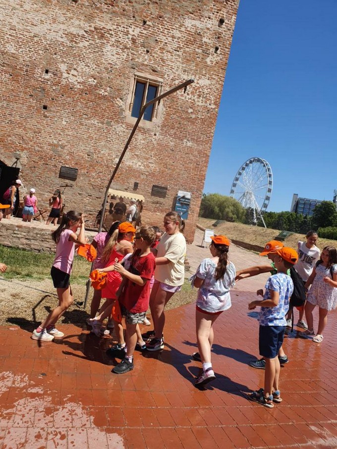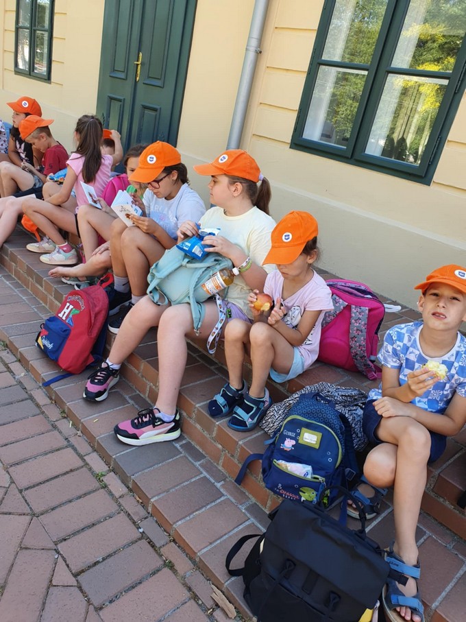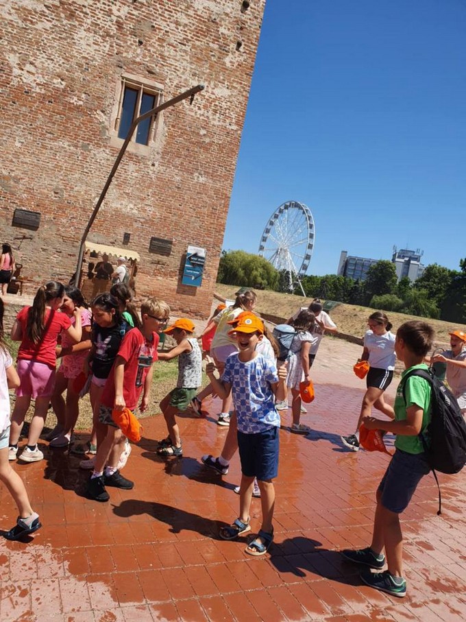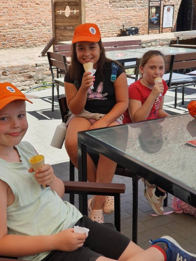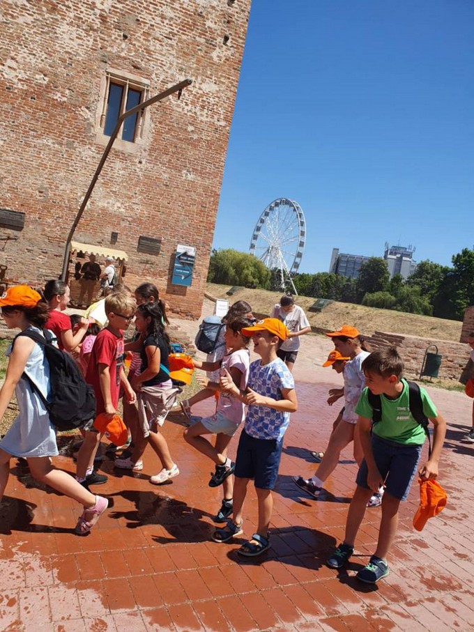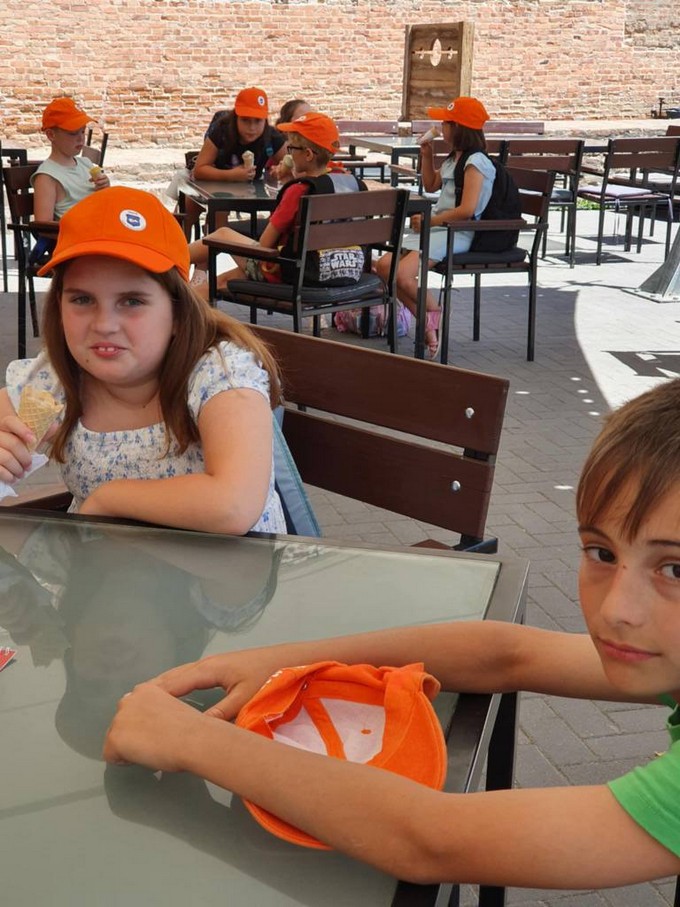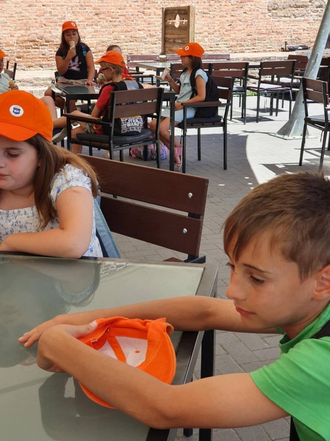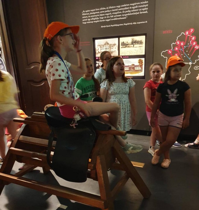 A mai nap ránk váró rekkenő hőség ellenére a Sakk tábor lelkes kis csapata továbbra is kitartó volt, úgyhogy reggel 7:30-kor már a vonatpótló autóbuszon ültünk egészen Kötegyánig. Onnan pedig vonattal utaztunk tovább Gyuláig. Kis séta és már meg is érkeztünk az Almásy-kastélyhoz. A tárlatvezető sok mindenre kiterjedő részletességgel beszélt a kastély történetéről, lakóiról, a személyzetről, azok feladatairól. Megismerhettük a régi világban itt élők mindennapi életét, szokásait, használati- illetve díszes, értékes tárgyait. Nagyszerű élményt nyújtottak az interaktív megoldások. A rögtönzött mini színjátszó társulatunk egy árnyékszínházat is elénk varázsolt és bemutatott egy lánykérést a nézők nagy örömére. Hazaindulás előtt jól esett egy fagyi a vár falainál. Az itt lévő párakapu lehűtött bennünket, így jó hangulatban eltöltöttünk egy kis időt a közeli játszótéren.