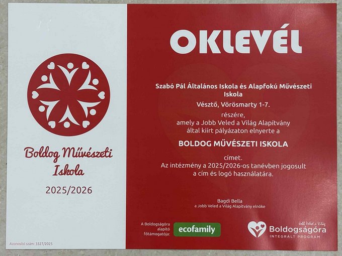 2025. november 11-én vette át a Boldog Művészeti Iskola címet iskolánk Budapesten ünnepélyes keretek között a Lurdy-házban megrendezett Boldog Intézmények Címátadó Ünnepségen. A Szabó Pál Általános Iskola és Alapfokú Művészeti Iskola a 2025/2026-os tanévben pályázatot nyújtott be a Boldog Iskola Integrált Programba. A feltételeket teljesítettük, a jelentkezés sikeres volt, így öt pedagógus kezdte meg a munkát alsó és felső tagozaton, valamint a Művészeti Iskolában. A Jobb Veled a Világ Alapítvány programja a pozitív pszichológia kutatási eredményeire épített élménypedagógiai módszertan, melynek hatékonyságát az ELTE PPK empirikus kutatásokkal igazolta. A Boldogságóra Program, melyet 2025-ben beválasztottak a világ leghatásosabb iskolai jóllét programja közé, mind a tanárok, mind a gyermekek lelki jóllétével foglalkozik, sőt a szülők bevonására is lehetőséget nyújt. Jó kiegészítője lehet az iskolai munkának, hiszen segítségével lehetőség nyílik arra, hogy a hagyományos tudásmegosztást és az életben szükséges személyes és szociális kompetenciák fejlesztését összhangba hozzuk. A program alapítója Bagdi Bella, fővédnöke prof. Dr. Bagdy Emőke, tudományos szaktanácsadó prof. Oláh Attila.