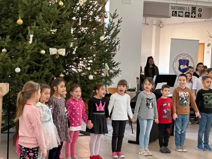 Bár a meteorológusok nem ígérnek nekünk fehér karácsonyt, iskolánk kis társastáncosai mégis odavarázsolták nekünk a puha hópihéket, a fehér hótakarót Hópihetáncukkal. Őket az alsós évfolyamok követték, egy -egy produkcióval: az elsősök verset mondtak, a másodikosok és harmadikosok énekeltek és minden szépet kívántak. A negyedik évfolyam saját versein túl bekapcsolódott a felső tagozatosok műsorszámaiba is. A karácsony szellemét leginkább ez az együttműködés, kicsi és nagy közötti összhang hozta el közénk. Ezt erősítette tovább az utolsó gyertya meggyújtása is, melyet egy elsősünk, Berke Bella, és egy nyolcadikosunk, Bagó Zsófia közösen gyújtott meg. Közben művésztanáraink játszottak nekünk karácsonyi dallamokat, tanulóink, Forrás Boglárka és Somlyai Zsombor közreműködésével. Persze a meghitt pillanatok mellett a vidámság is elfért az Aulában: volt közös flashmob, tánc és nevetés is.