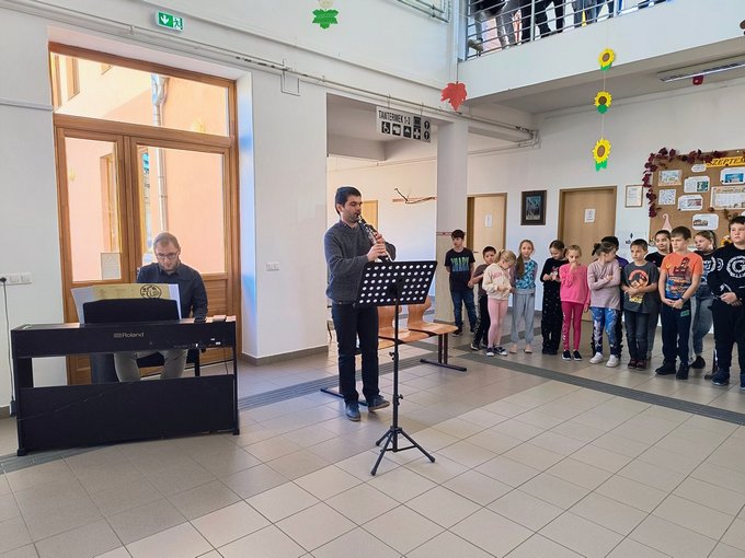 1975 óta október elsején ünnepeljük a zene világnapját szerte a világon, mivel Yehudi Menuhin világhírű hegedűművész ekkor kezdeményezte az Unesconál eme jeles nap megünneplését. A gyermekek legnagyobb örömére iskolánk is megemlékezett e jeles napról egy rövid koncerttel, és egy játékos zenedarab előadásával. Kun Rajmund zongoratanár az iskolásokat bevonva szemléltette, hogy akár csettintéssel, tapsolással, dobbantással az eső csepergését és zuhogását, valamint mennydörgést utánozva is képesek vagyunk zenélni. Ezután felcsendült egy reneszánsz magyar tánc, melyet Nyekita Zotmund Zoltán 2. a osztályos tanuló adott elő furulyán, végül pedig Vittorio Monti: Csárdás című műve hangzott el, melyet Kun Rajmund zongorán és Szabó Tamás klarinéton adtak elő.