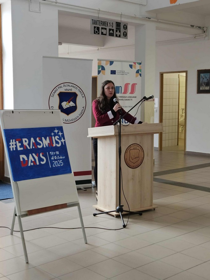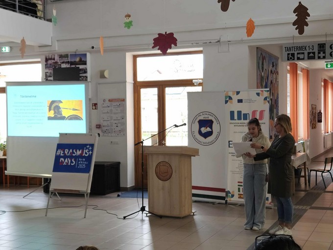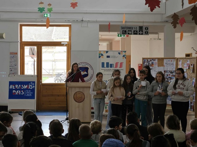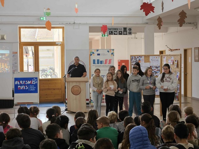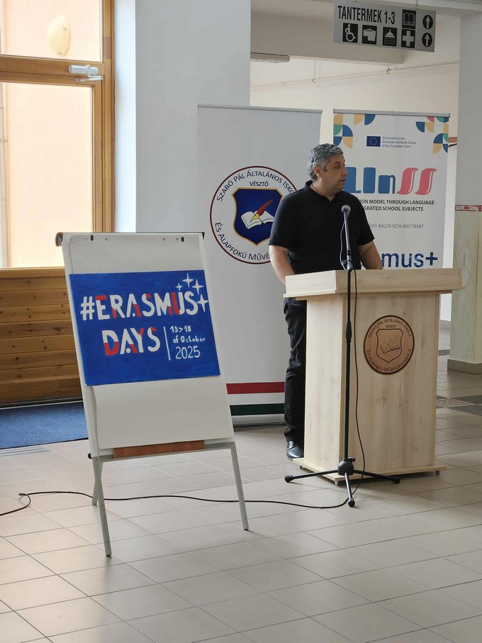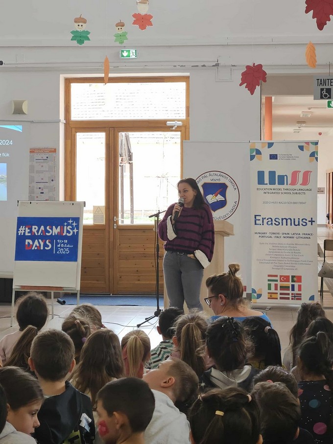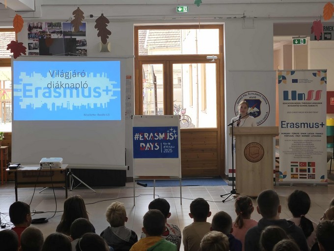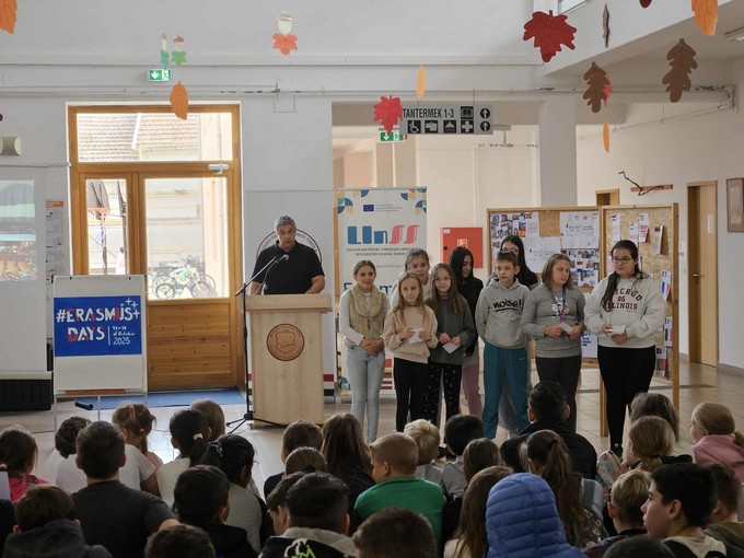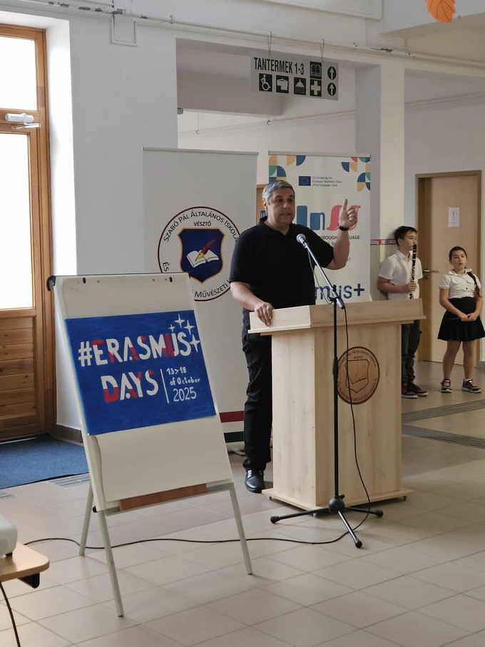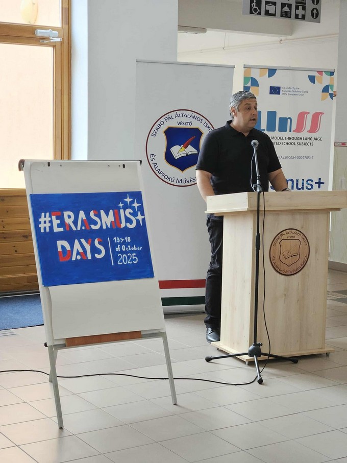 2025. október 18 - án került megrendezésre a Szabó Pál Általános Iskola és Alapfokú Művészeti Iskolában az Erasmus - Day, amely egy híres nemzetközi kezdeményezés. A nap folyamán színes programokon keresztül ismerkedhették meg a tanulók az Európai Unió országaival, értékeivel. Az eseményt Orbán István főigazgató úr nyitotta meg, beszédében hangsúlyozta az iskolában zajló Erasmus programokat és az idegen nyelv oktatás fontosságát. Szabó Tamás és kollégái valamint a Művészeti Iskola növendékeinek előadásban hallgathattuk meg az Örömódát valamint A zene az kell című dalt. A felső évfolyamok bemutatói által megismerkedhettünk az Európai Unió országaival, nevezetességeivel, az alsósok pedig angol nyelvű versekkel és dalokkal színesítették a programot. Ezt követően iskolánk tanárai és volt diákjai beszéltek saját élményeikről, tapasztalataikról, amelyeket a mobilitások során gyűjtöttek. A következő blokkban több interaktív műhelyben zajlottak a programok, voltak kreatív foglalkozások, sport tevékenység, kultúra és idegen nyelvi sarok, mindezek hozzájárultak ahhoz, hogy a tanulók több információt szerezzenek az európai kultúráról, az országok történelméről. Az esemény zárásaként együtt énekeltük az Örömódát és megtekinthettük a nap folyamán elkészített csodálatos alkotásokat. Köszönjük szépen mindenki hozzájárulását, segítséget! Reméljük, hogy egy igazán izgalmas és tartalmas napra emlékezhetünk vissza! Képek a felső tagozatból